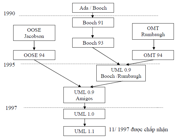 - Đồng thời thống nhất được nhiều ký pháp, khái niệm của các phương pháp khác. Quá trình hình thành UML bắt đầu từ ngôn ngữ Ada (Booch) trước năm 1990 (hình 2-1).