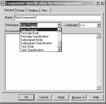 4. Về mục General tab, có thể đặt tên mới cho thành phần ở hộp Name, chọn kiểu cho thành phần đó ở hộp Stereotype, và gán ngôn ngữ cài đặt cho thành phần này ở hộp Language.