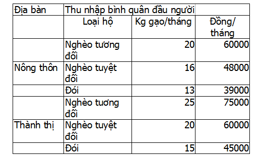 Chuẩn mực nghèo đói trên địa bàn thành thị và nông thôn (Do Bộ lao động và thương binh xã hội quy định):