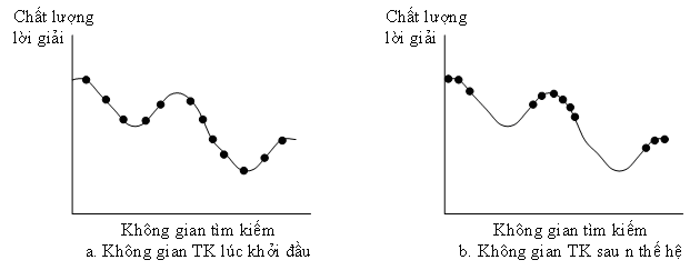 Một sức mạnh quan trọng của thuật toán di truyền là bản chất song song trong tìm kiếm của nó. Các thuật toán này thực hiện một dạng mạnh của leo núi (hill climbing) trong đó duy trì nhiều lời giải (trong quần thể các lời giải), loại bỏ những lời giải không có triển vọng, và nâng cao chất lượng của những lời giải tốt. Hình 9.19 phỏng theo Holland (1986), cho thấy nhiều lời giải hội tụ về các điểm tối ưu trong không gian tìm kiếm. Trong hình này, trục hoành biểu diễn các điểm có thể có trong không gian lời giải, trong khi trục tung phản ánh chất lượng của những lời giải đó. Các điểm chấm nằm trên cung là các thành viên của quần thể hiện tại. Khởi đầu, những lời giải được rải trong không gian những lời giải có thể có. Sau một vài thế hệ, chúng có khuynh hướng cụm lại xung quanh những vùng có chất lượng lời giải cao hơn.