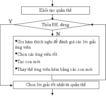 - Điều kiện dừng của vòng lặp: có thể là chương trình đạt tới một số lần lặp nhất định nào đó, hay đạt tới trung bình độ tốt nào đó của quần thể,…