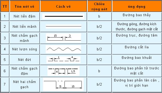 - Các loại nét vẽ thường được dùng trên bản vẽ cơ khí và ứng dụng của chúng (Bảng 1.1) được quy định theo TCVN 8 -1993 Chiều rộng nét vẽ được kí hiệu là b (mm) và được chọn theo dãy quy định sau: 0,18; 0,25; 0,35; 0,5; 0,7; 1; 1,4 ....