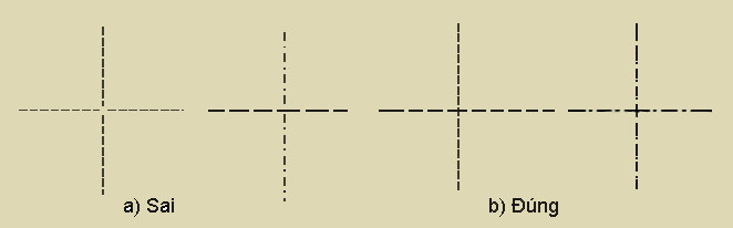 - Trong mọi trường hợp, tâm đường tròn phải được xác định bằng giao điểm của hai đoạn gạch của nét chấm gạch; các nét đứt, nét chấm gạch phải giao nhau bằng các gạch.