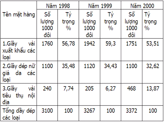 - Như vậy qua bảng sơ cấu xuất khẩu sản phẩm tại công ty Giầy Thuỵ Khuê chúng ta thấy hoạt động sản xuất của công ty tập trung xấp xỉ trên dưới 90% dành cho xuất khẩu và chỉ có khoảng 10% dành cho nội địa. Hoạt động sản xuất và kinh doanh tập trung chủ yếu vào giấy xuất khẩu chiếm khoảng 50% tỷ trọng trong các mặt hàng, trong khi giầy dép da xuất khẩu chiếm trên 30% tỷ trọng và chỉ có 10% cho giầy vải tiêu thụ nội địa.