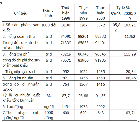 - Nhìn vào bảng biểu kết quả trên ta thấy doanh thu hàng năm không ngừng tăng lên luôn trên 10% (năm sau cao hơn năm trước), nếu năm 1998 là 74,090 tỷ đồng thì đến năm 1999 đã là 88,201 tỷ và đến năm 2000 là 99,330 tỷ với tỷ lệ tăng tương ứng là 1999/1998:19,04%; 2000/1999: 12,62%. Trong đó doanh thu của công ty từ xuất khẩu tương ứng theo các năm là 1998:71,339 tỷ; năm 1999 là 85,333 tỷ và năm 2000 là 94,401 tỷ. Doanh thu từ xuất khẩu luôn chiếm trên 80% sản lượng tổng doanh thu. Với tỷ lệ tăng này, chứng tỏ rằng công ty đã có sự năng động trong việc nghiên cứu và mở rộng thị trường và phát triển sản phẩm mới phục vụ nhu cầu thị hiếu tiêu dùng nước ngoài.