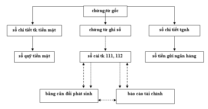 từ các chứng từ gốc như là các phiếu chi, phiếu thu, các giấy báo có, báo nợ…. kế toán tiến hành lập chứng từ ghi sổ. đồng thời căn cứ vào các chứng từ gốc kế toán tiền mặt vào các sổ chi tiết tiền mặt và sổ quỹ tiền mặt, còn kế toán tiền gửi ngân hàng vào sổ chi tiết tiền gửi ngân hàng và sổ tiền gửi ngân hàng. đến cuối 6 tháng đầu năm và 6 tháng cuối năm từ các chứng từ ghi sổ đã lập kế toán vốn bằng tiền tiến hành vào sổ cái các tk 111, tk 112 từ đó vào bảng cân đối phát sinh và lập báo cáo tài chính.