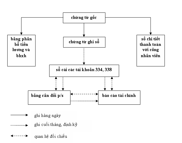 hàng ngày căn cứ vào chứng từ gốc kế toán tiền lương lập chứng từ ghi sổ. các chứng từ gốc sau khi làm căn cứ lập chứng từ ghi sổ được dùng để ghi vào sổ chi tiết thanh toán với công nhân viên, dùng vào bảng phân bổ tiền lương và bhxh. căn cứ vào các chứng từ ghi sổ định kỳ 6 tháng đầu năm và sáu tháng cuối năm kế toán vào sổ cái các tk 334, 338, rồi từ sổ cái vào bảng cân đối phát sinh và lập báocáo tài chính.