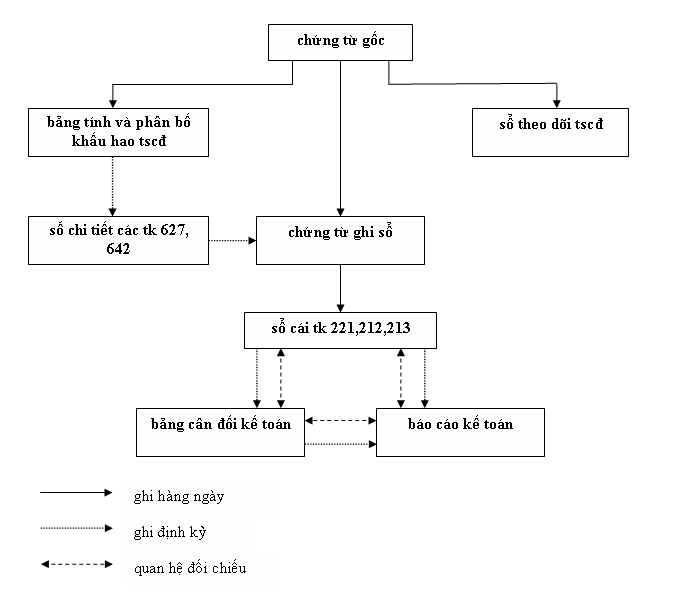 hàng ngày căn cứ vào các chứng từ gốc, kế toán tài sản cố định lập chứng từ ghi sổ. các chứng từ gốc sau khi làm căn cứ lập chứng từ ghi sổ được dùng để ghi vào sổ theo dõi tài sản cố định, vào bảng tính và phân bổ khấu hao, sau đó vào sổ chi tiết các tk được phân bổ 627, 642. căn cứ vào các chứng từ ghi sổ định kỳ 6 tháng đầu năm và 6 tháng cuối năm kế toán vào sổ cái tk 211, 212, 213 rồi vào bảng cân đối kế toán rồi lập báo cáo tài chính.