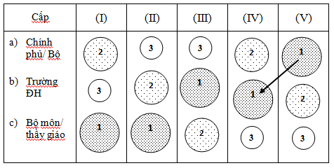 GDĐH với những hạt nhân là các trường ĐH có đặc điểm: “Tiêu điểm về mặt tổ chức là môn học và đơn vị tổ chức thường là bộ môn”. Mặt khác, “các mục tiêu của GDĐH thực cũng không dễ xác định, thậm chí khó có thể đồng ý với nhau trong nhiều trường hợp” (Gareth L. Williams, 1996). Chính vì vậy, GDĐH thường được tổ chức theo kiểu “phân quyền”, “phi tập trung hóa” và các trường ĐH thường được xem như là những tổ chức có cấu trúc “đuôi – nặng” (Bottom – Heavy); bao gồm những nhà giáo chịu trách nhiệm cá nhân hoặc tập thể về hầu hết các quyết định có tính học thuật. Tuy nhiên, do những đặc điểm lịch sử cũng như chính sách an sinh xã hội của các nước là khác nhau, cấu trúc tổ chức quản lý hệ thống GDĐH ở các nước cũng khác nhau. Theo [Burton Clark, 1983], cho đến những năm 60, 70 của thế kỷ trước, có 3 kiểu phân phối thẩm quyền ra – quyết – định trong GDĐH ở các nước phát triển, nếu xét theo 3 mức: a) Chính phủ / Bộ quản lý, b) Trường ĐH, Hội đồng trường / Ban giám hiệu và c) Bộ môn, thầy cô giáo, như ở sơ đồ sau: