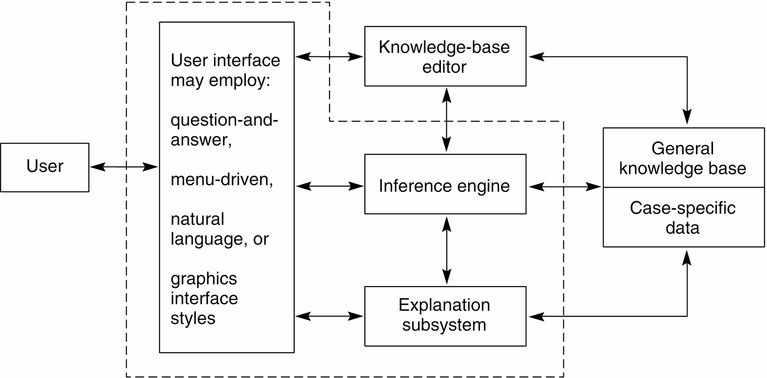 Hình 6_1 cho thấy các module quan trọng nhất tạo nên một hệ chuyên gia dựa trên luật. Người dùng tương tác với hệ chuyên gia thông qua một giao diện người dùng (user interface), giao diện này đơn giản hóa việc giao tiếp và che giấu phần lớn sự phức tạp của hệ thống (ví dụ như cấu trúc bên trong của cơ sở các luật). Các hệ chuyên gia sử dụng một số lượng phong phú các kiểu giao diện, bao gồm hỏi và trả lời, điều khiển bởi trình đơn, ngôn ngữ tự nhiên, hay đồ họa,… Việc quyết định sử dụng giao diện như thế nào là sự thỏa hiệp giữa nhu cầu của người dùng với những đòi hỏi của cơ sở tri thức và hệ suy diễn.