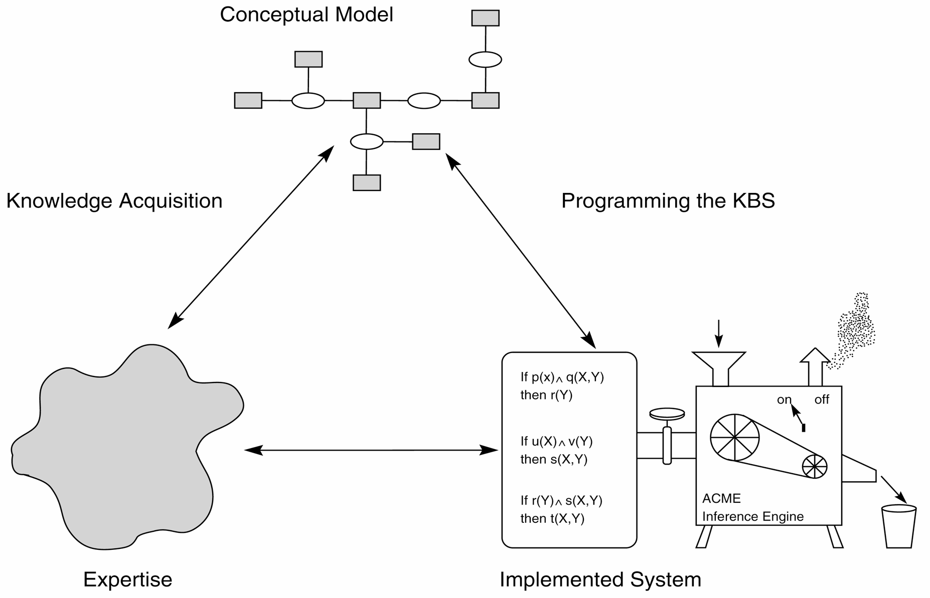 Hệ quả là, công nghệ tri thức là một quá trình khó khăn và cần được xem xét khi kéo dài chu trình sống của bất kỳ HCG nào. Để đơn giản hóa nhiệm vụ này, người ta cài đặt một mô hình khái niệm (conceptual model) nằm giữa hiểu biết chuyên môn của con người với chương trình như trong hình 6_3. Mô hình khái niệm này thể hiện nhận thức của người kỹ sư tri thức về lĩnh vực đó, nó có thể bao gồm các từ điển dữ liệu, các biểu diễn đồ họa của không gian trạng thái và những lời bình đi kèm đều có thể là một phần của mô hình này.