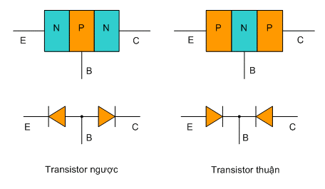 Cấu tạo của transistor tương đương với hai diode đấu ngược chiều nhau như hình sau. Ba lớp bán dẫn được nối ra thành 3 cực của transistor.