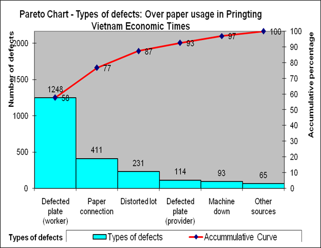 - Discuss the major causes of defects presented by the Pareto Chart to your working group, such as QC division of the factory. Line managers may also involve in this process. Analyze the important types or causes of defects. Are there any factors can be eliminated? Factor with highest frequency should be prioritized to be solved first.