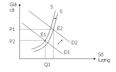Trên hình vẽ thể hiện, ban đầu tình hình cung cầu ở mức E1, do nhu cầu về đất đai tăng lên dẫn đến đường cầu dịch chuyển từ D1 đến D2, trong khi đó cung đất đai chỉ tăng từ S1 đến S2 và sự tăng này thấp hơn sự tăng của cầu có phần do cung đất đai do khu vực Nhà nước cung cấp là thiếu hụt cộng với hoạt động đầu cơ gây ra, giá tăng từ P1 đến P2, ngay cả khi giá đến P2 người đầu cơ cũng chưa có ý định trao đổi đất đai đó mà còn mong chờ mức giá cao hơn nữa.