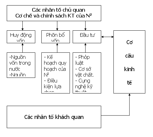 Một trong những mục tiêu phát triển dài hạn của các nước dang phát triển là tăng trưởng, đạt được cơ cấu kinh tế hợp lý, hiệu quả. Kinh nghiệm cho đến nay cho thấy những nước có chính sách đầu tư hợp lý trong thời kỳ đầu sẽ tạo đà đạt được các mục tiêu. Chính sách đầu tư không chỉ là việc huy động vốn mà còn là việc phân bổ các nguồn vốn sao cho đạt hiệu quả kinh tế lớn nhất. Để mô tả tác động của đầu tư đối với quá trình chuyển dịch, người ta đã mô hình hóa theo lược đồ khối sau: