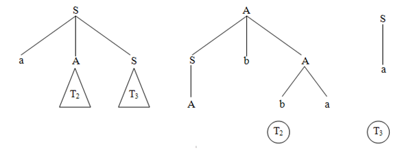 Bước đầu tiên trong dẫn xuất đó là S → aAS. Theo dõi các bước suy dẫn sau đó, ta thấy biến A được thay bởi SbA, rồi trở thành abA và cuối cùng thành abba, đó chính là kết quả của cây T2 (A - cây). Còn biến S thì được thay bởi a và đó là kết quả của cây T3 (S -cây). Ghép nối lại, ta được cây dẫn xuất mà kết quả là chuỗi aabbaa như dưới đây.