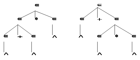 Văn phạm này sinh ra các chuỗi biểu thức số học với 2 phép toán + và * . Với chuỗi a + a * a, ta có thể vẽ đến hai cây dẫn xuất khác nhau như sau :