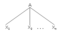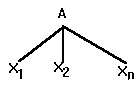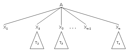 Bây giờ ta dựng A - cây có n lá X 1 X 2 ... X n . Mỗi X i không là ký hiệu kết thúc ta thay bằng cây T i tương ứng. Cuối cùng, ta có cây dẫn xuất sinh ra có dạng như sau :