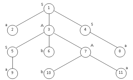 Ta thấy, nút 1 có nhãn S và các con của nó lần lượt là a, A, S (chú ý S → aAS là một luật sinh). Tương tự, nút 3 có nhãn A và các con của nó là S, b, A (từ luật sinh A → SbA). Nút 4, 5 có cùng nhãn S và có nút con nhãn a (luật sinh S → a). Cuối cùng nút 7 có nhãn A và có các nút con b, a (luật sinh A → ba).