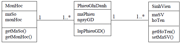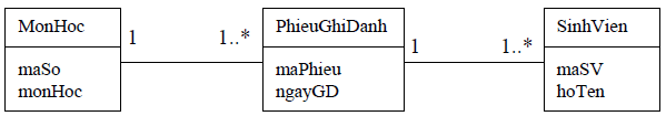 Hãy xét phiếu ghi danh ở hình 1, nó được sinh ra dựa vào sự lựa chọn môn học của sinh viên. Một sinh viên lại có thể ghi danh nhiều môn học, một môn học được nhiều sinh viên ghi danh. Sự tham chiếu giữa các lớp được biểu diễn bằng quan hệ kết hợp trong biểu đồ lớp như hình 2.