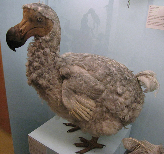 One of the earlier and popularly known examples is the dodo bird. The dodo bird lived in the forests of Mauritius, an island in the Indian Ocean. The dodo bird became extinct around 1662. It was hunted for its meat by sailors and was easy prey because the dodo, which did not evolve with humans, would approach people without fear. Introduced pigs, rats, and dogs brought to the island by European ships also killed dodo young and eggs ([link]).